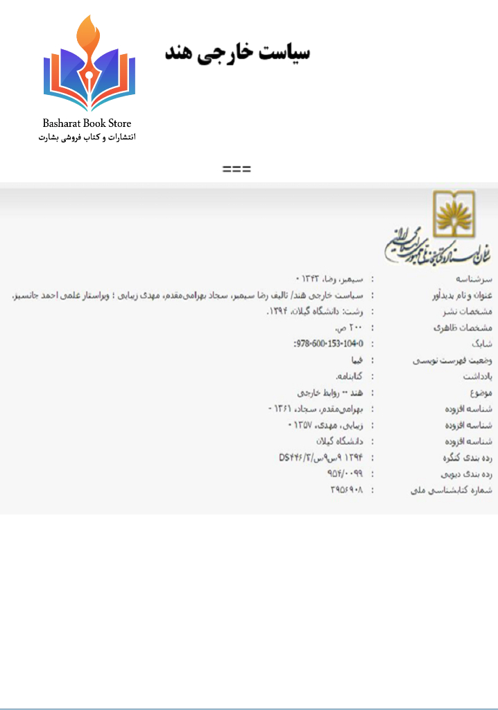 کتاب «سیاست خارجی هند» مطالعهای تحلیلی از راهبردها و سیاستهای بینالمللی هند ارائه میدهد. نویسنده با بررسی روابط دیپلماتیک، همکاریهای اقتصادی، مسائل امنیتی و نقش هند در سازمانها و تحولات جهانی، تصویری جامع از اهداف و چالشهای سیاست خارجی این کشور ارائه میکند. این اثر برای دانشجویان علوم سیاسی، روابط بینالملل، مطالعات آسیایی و پژوهشگران سیاست خارجی منبعی کاربردی و آموزشی محسوب میشود.